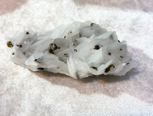 白い薔薇の花びらような薄い結晶が幾層にも重なり合うカルサイトの上に、チャルコパイライト(黄銅鉱)が星屑のようにキラキラと輝く美しい共生鉱物です。